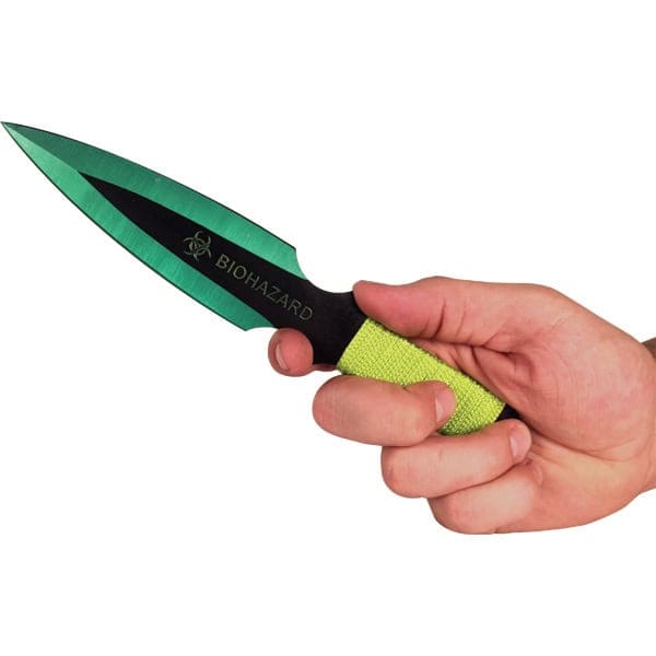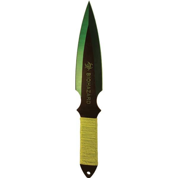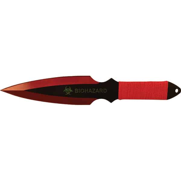 2 Piece Throwing Knife BioHazard. 9" Length, 2 Piece Set, made from 440 stainless steel, great beginner to intermediate throwing knife. Includes sheath pouch for knives. Available in 2 colors: red, green